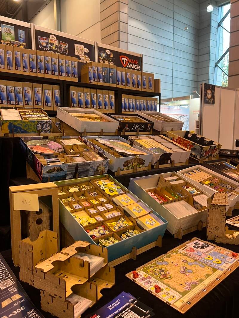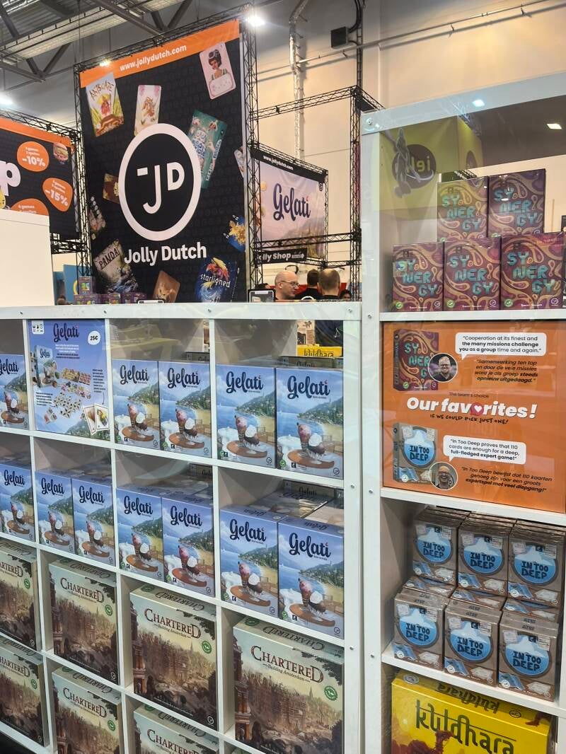 In de hal lagen honderden nieuwe spellen uitgestald. Geen drukte, geen wachtrijen, maar tafels vol nieuwe releases die je rustig kon bekijken. Dozen stonden open zodat illustraties, componenten en spelborden meteen zichtbaar waren. Van kleine kaartspellen tot grote strategische titels, alles lag naast elkaar. Het voelde een beetje alsof je een preview kreeg van het komende bordspeljaar.
